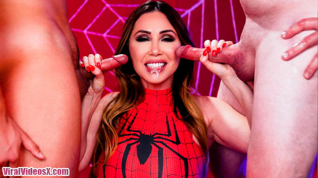 Statuesque, stacked stunner Kianna Dior portrays The Amazing SpiderGirl in a special parody scene for Halloween! The long-haired MILF beauty's skin-tight, red-and-black disguise shows off her big boobs. She takes off her mask, drawing two hard-ons (and the audience) into her web! Hungering to give blowjobs, Kianna kneels between two naked, ready erections. When she's not wetly sucking Jonni Darkko and Jay Smooth's hard boners, she's talking dirty! Kianna swirls her tongue on the tools and strokes the shafts with manicured fingers. Drool runs down her chin. She groans, gurgles and gasps as Jonni's big cock fucks her throat. This BJ superhero deepthroats both dicks, sucks balls and plays with the slobber strands connecting the pricks to her face. Wanting her semen fix, Kianna says, 'Blow your web on my face.' A thick, sloppy double cum facial coats her forehead and fills her eye sockets, dripping onto her tongue and tits. The guys' rods smear jism into her skin and mouth. She swallows sperm, saying her super powers are increasing! A graphic instant replay shows the facial slathering again, close up and in slow-motion!