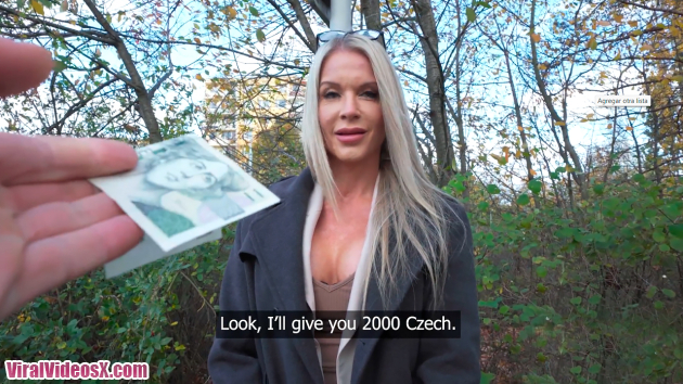 Miss Sally and that she comes from the UK. The gorgeous blonde confessed she doesn't earn much, so I offered her some extra cash in exchange for sexual favours. After flashing me her beautiful titties, we found somewhere more secluded where Miss Sally got on her knees and gobbled up my thick dick! Following an incredible blowjob, I gave the filthy slut a few more euros to let me fuck her. Feeling horny, she stuck out her nice ass, and I banged her from behind in doggy, and then the stocking-clad MILF straddled me cowgirl-style. To finish, I pounded Miss Sally’s tight pussy in missionary until she reached orgasm, and then I spunked in her mouth!