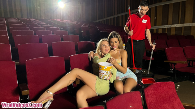 Angie Lynx are putting on a show of their own in the movie theater, hungrily kissing and fingering each other until they're dripping wet. The babes don't even leave when the lights come up and the movie ends, because they're not done. Usher Jordi El Nino Polla walks in to clean up, discovering Ada licking blonde Angie's pussy. Angie sucks the lucky guy while her GF pleasures her, then Jordi gets to fuck both babes as they squirt all over him before he returns the favor with a double facial.
